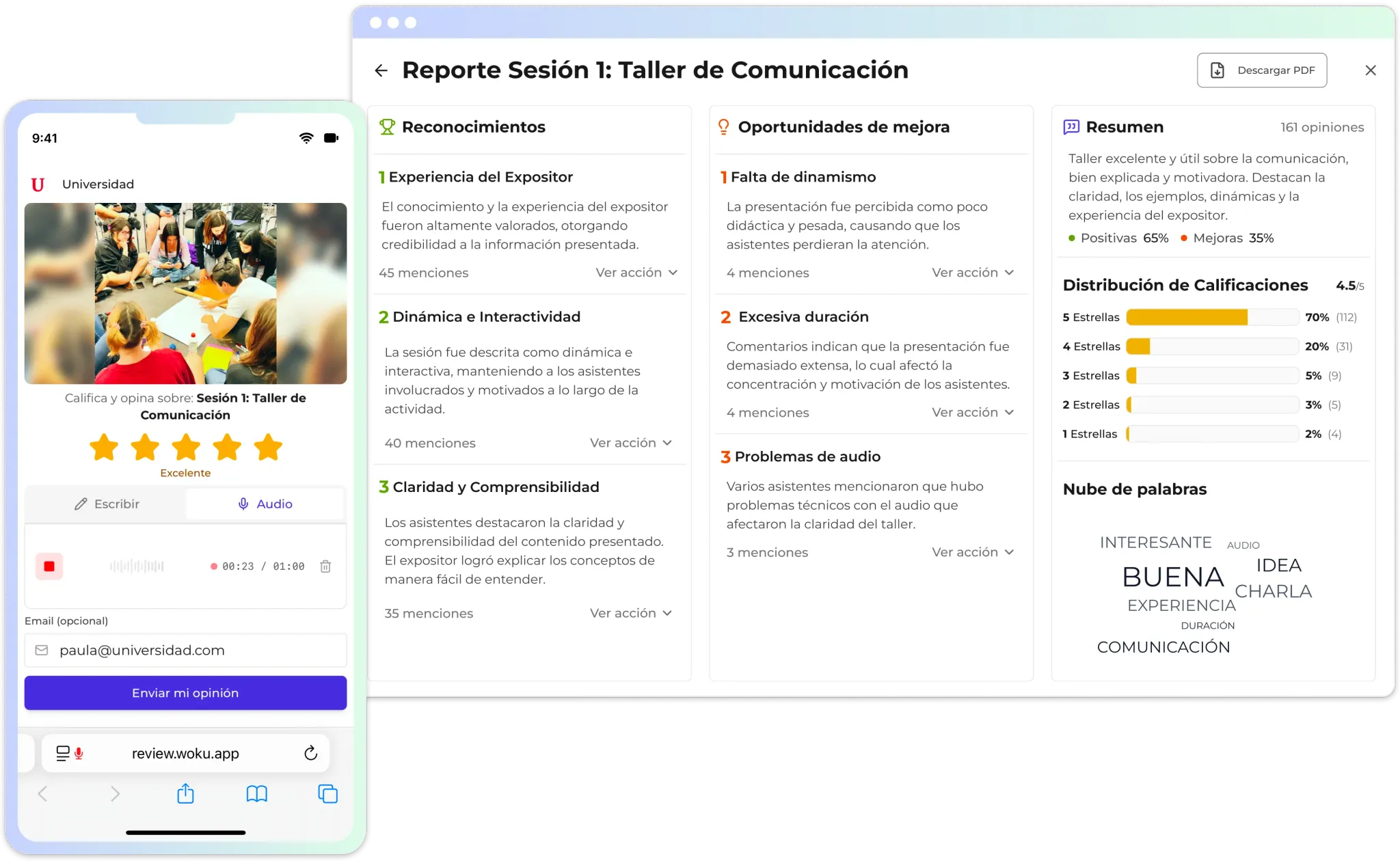 Tu audiencia califica 1-5 estrellas y deja su opinión en texto o audio, en menos de un minuto.